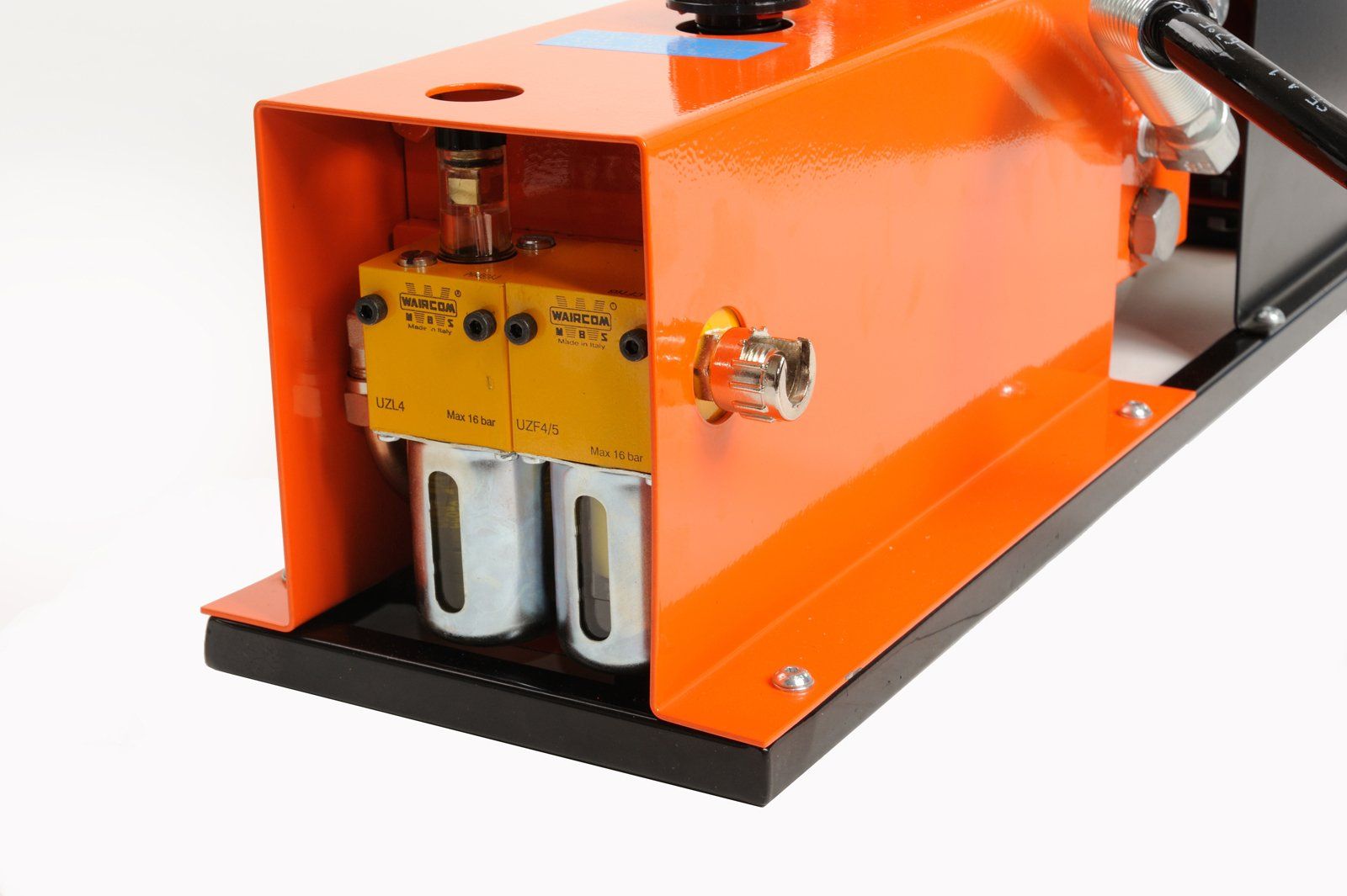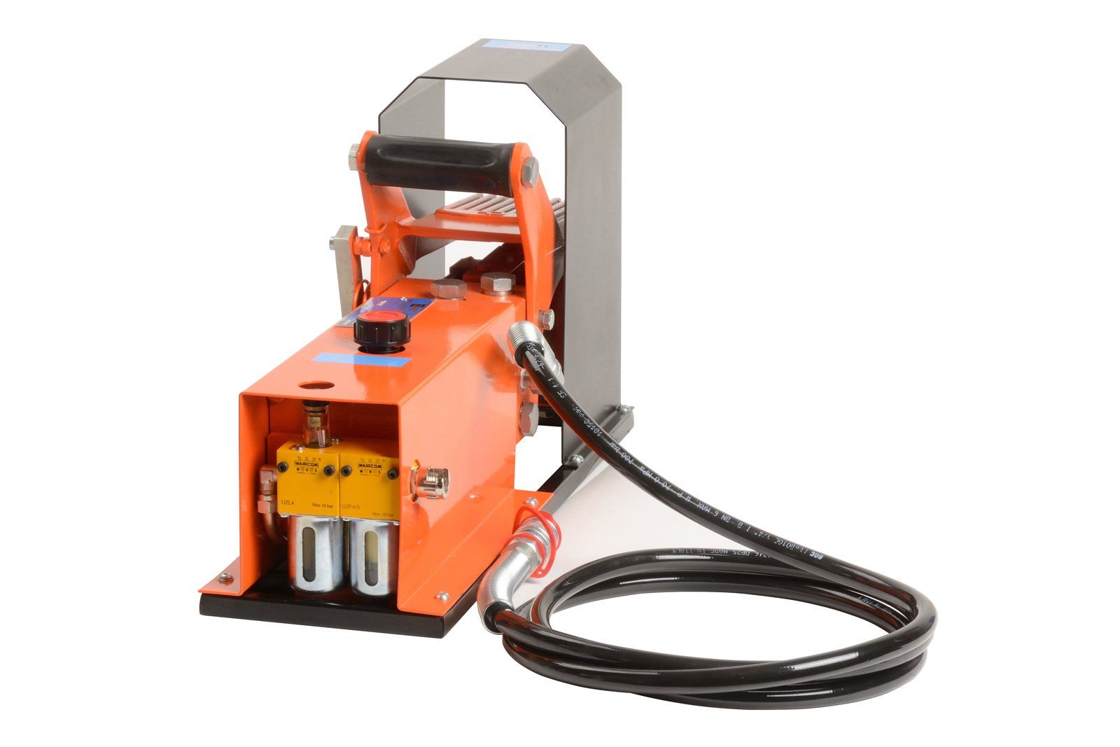 The pneumatic pump 9002 is made with the same technology as the foot pump 9000, offering the advantage of more rapid operation as it uses compressed air to work with. It has two speeds, one for the approach and one for the working phase; it has therefore been equipped with double valves and double pistons. It is able to produce 700 bars when supplied with a constant pressure of 7÷10 bars by a suitable compressor or in-house centralised installation.
