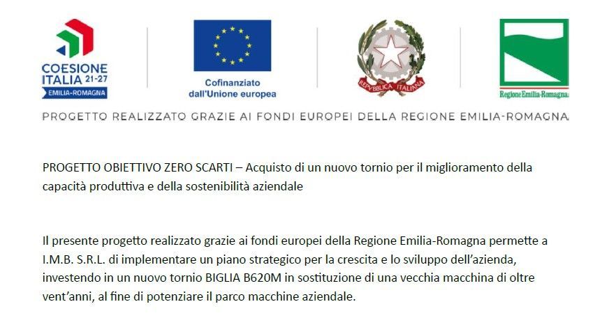 Il presente progetto realizzato grazie ai fondi europei della Regione Emilia-Romagna permette a I.M.B. S.R.L. di implementare un piano strategico per la crescita e lo sviluppo dell’azienda, investendo in un nuovo tornio BIGLIA B620M in sostituzione di una vecchia macchina di oltre vent’anni, al fine di potenziare il parco macchine aziendale.